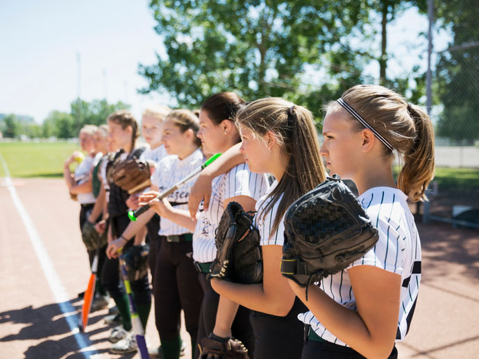 Coach Ames has just completed a field session on backing up throws with her group. The kids are sitting on the bench in the third base...